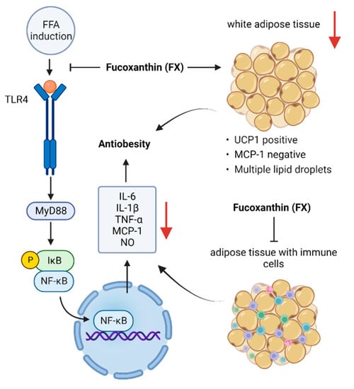 Figure 5. Pathway underlying the anti-obesity effects of fucoxanthin. Free fatty acids produced by adipocytes stimulate TLR4 receptors to induce inflammation. FX inhibits NF-κB entry into the nucleus and reduces the release of inflammatory factors, such as TNF-α, IL-6, and MCP-1, by modulating TLR4 receptors. FX also inhibits the release of inflammatory factors in adipocytes and macrophages infiltrating adipose tissue. Additionally, FX exerts anti-obesity effects by stimulating UCP-1 expression in white adipose tissue.