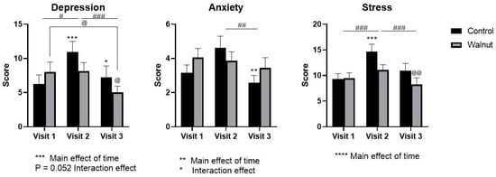 The effects of walnut consumption on perceived measures of depression, anxiety and stress before, during and after the university examination period in the 21-item Depression Anxiety Stress Scale. Clinical Visit 1 occurred during the first half of the university semester, Visit 2 occurred during the university examination period, and Visit 3 occurred at the end of the university semester. * (Below graph) Denotes significant main effects or interaction effects, * = p < 0.05, ** = p < 0.01, *** = p < 0.001, **** = p < 0.0001. * (On graph) Denotes a difference in control means compared to the immediately preceding visit unless otherwise indicated by lines, * = p < 0.05, ** = p < 0.01, *** = p < 0.001; @ denotes a difference in walnut means compared to the immediately preceding visit unless otherwise indicated by lines, @ = p < 0.05, @@ = p < 0.01; # denotes a difference in main effect of time (visit), # = p < 0.05, ## = p < 0.01, ### = p < 0.001. Mixed effects analyses followed by Bonferroni multiple comparisons. Visit 1: control n = 33; walnut n = 34. Visit 2: control n = 30; walnut n = 29. Visit 3: control n = 29; walnut n = 29. Small differences in sample size are due to participant withdrawals and incomplete responses to the questionnaire. Analyses performed on responses from all 3 cohorts.