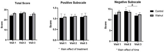 The effects of walnut consumption on the total score, positive subscale and negative subscales of perceived stress before, during and after the university examination period in the Perceived Stress Scale. Clinical Visit 1 occurred during the first half of the university semester, Visit 2 occurred during the university examination period, and Visit 3 occurred at the end of the university semester. * (Below graph) Denotes significant main effects, * = p < 0.05. * (On graph) Denotes a difference in control means compared to the immediately preceding visit, * = p < 0.05; # denotes a difference in main effect of time (visit), # = p < 0.05. Mixed effects analyses followed by Bonferroni multiple comparisons. Positive Subscale data transformed prior to analysis. Visit 1: control n = 33; walnut n = 34. Visit 2: control n = 30; walnut n = 29. Visit 3: control n = 29; walnut n = 30. Small differences in sample size are due to participant withdrawals and incomplete responses to the questionnaire. Analyses performed on responses from all 3 cohorts.