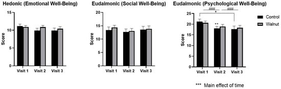 The effects of walnut consumption on perceived hedonic and eudaimonic well-being before, during and after the university examination period in the short form-Mental Health Continuum. Clinical Visit 1 occurred during the first half of the university semester, Visit 2 occurred during the university examination period, and Visit 3 occurred at the end of the university semester. * (Below graph) Denotes significant main effects, *** = p < 0.001. * (On graph) Denotes a difference in control means compared to the immediately preceding visit unless otherwise indicated by lines, * = p < 0.05, ** = p < 0.01; # denotes a difference in main effect of time (visit), ### = p < 0.001. Mixed effects analyses followed by Bonferroni multiple comparisons. Hedonic (Emotional Well-Being) data transformed prior to analysis. Visit 1: control n = 33; walnut n = 34. Visit 2: control n = 30; walnut n = 29. Visit 3: control n = 29; walnut n = 30. Small differences in sample size are due to participant withdrawals and incomplete responses to the questionnaire. Analyses performed on responses from all 3 cohorts.