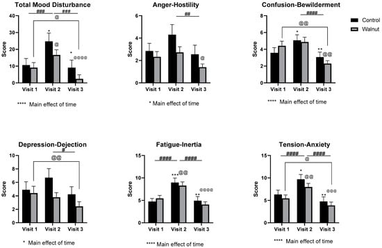 The mean scores for the POMS are presented in Figure 4. The POMS assesses distinct mood states across 5 dimensions (Anger-Hostility; Confusion-Bewilderment; Depression-Dejection; Fatigue-Inertia; Tension-Anxiety) using items on a 5-point scale []. All participants were asked to respond to the questionnaire based on how they felt at present. Scores from each of the 5 dimensions were summed to provide a total mood disturbance score. A significant increase in total mood disturbance was observed in both the treatment and control group at visit 2 compared to visit 1 (Control: 14.09 ± 4.46; p = 0.011. Walnut: 7.567 ± 2.94; p = 0.0472), with this score decreasing for both groups again at visit 3 (Control: −15.63 ± 5.24; p = 0.0176. Walnut: −14.26 ± 2.51; p < 0.0001). A significant main effect of time on total mood disturbance was also observed (p < 0.0001) with increased scores between visit 1 and visit 2 (p = 0.0004) and decreased between visit 2 and visit 3 (p < 0.0001), indicating overall that academic stress experienced at visit 2 had a negative effect on mood in participants. Regarding each of the dimensions, a significant main effect of time on each dimension score for all dimensions was observed (Anger-Hostility: p = 0.0115; Confusion-Bewilderment: p < 0.0001; Depression-Dejection: p = 0.0223; Fatigue-Inertia: p < 0.0001; Tension-Anxiety: p < 0.0001), with only the Fatigue-Inertia and Tension-Anxiety dimensions showing a significant overall increase on score from visit 1 to visit 2 (p < 0.0001; p < 0.0001). No significant differences were found for Anger-Hostility scores at visit 2, while a significant decrease was observed at visit 3 for the treatment group compared to their scores at visit 2 (−1.324 ± 0.43; p = 0.0138). A significant increase was observed for Confusion-Bewilderment, Fatigue-Inertia and Tension-Anxiety scores in the control group at visit 2 compared to visit 1 (Confusion-Bewilderment: 1.491 ± 0.58; p = 0.0488. Fatigue-Inertia: 4.239 ± 0.0009. Tension-Anxiety: 3.397 ± 1.07; p =0.0102) as well as decreases at visit 3 compared to visit 2 (Confusion-Bewilderment: −1.998 ± 0.59; p = 0.0064. Fatigue-Inertia: −4.036 ± 1.05; p = 0.002. Tension-Anxiety: −4.941 ± 1.31; p = 0.0023), indicating that these dimensions contributed to the increased total mood disturbance observed at visit 2. While walnut consumption did not attenuate increases in scores for any of the dimensions, there were significant decreases in scores from visit 2 to visit 3 (Anger-Hostility: −1.324 ± 0.43; p = 0.0138. Confusion-Bewilderment: −2.562 ± 0.68; p = 0.0022. Fatigue-Inertia: −4.209 ± 0.78; p < 0.0001. Tension-Anxiety: −4.099 ± 0.87; p = 0.0002).