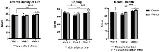 The effects of walnut consumption on perceived overall quality of life, coping capabilities and overall mental health before, during and after the university examination period in the 8 dimension-Assessing Quality of Life Questionnaire. Clinical Visit 1 occurred during the first half of the university semester, Visit 2 occurred during the university examination period, and Visit 3 occurred at the end of the university semester. * (Below graph) Denotes significant main effects, ** = p < 0.01, *** = p < 0.001.* (On graph) Denotes a difference in control means compared to the immediately preceding visit unless otherwise indicated by lines, * = p < 0.05, ** = p < 0.01, *** = p < 0.001; @ denotes a difference in walnut means compared to the immediately preceding visit unless otherwise indicated by lines, @@ = p < 0.01; @@@ = p < 0.001; # denotes a difference in main effect of time (visit), # = p < 0.05, ### = p < 0.001, #### = p < 0.0001. Mixed effects analyses followed by Bonferroni multiple comparisons. Visit 1: control n = 34; walnut n = 33. Visit 2: control n = 30; walnut n = 29. Visit 3: control n = 29; walnut n = 30. Small differences in sample size are due to participant withdrawals and incomplete responses to the questionnaire. Analyses performed on responses from all 3 cohorts.