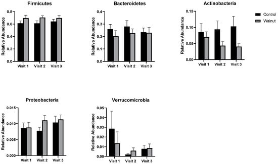 Relative abundance of bacterial phyla in the gut microbiome of females in cohort 2 & 3 across a university semester. Clinical Visit 1 occurred during the first half of the university semester, Visit 2 occurred during the university examination period, and Visit 3 occurred at the end of the university semester. Visit 1: control n = 14; walnut n = 11. Visit 2: control n = 11; walnut n = 10; Visit 3: control n = 11; walnut n = 9. Results from cohort 2 and 3 are pooled.