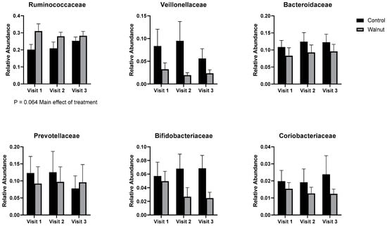 Relative abundance of bacterial families in the gut microbiome of females in cohort 2 & 3 before, during and after the university examination period. Clinical Visit 1 occurred during the first half of the university semester, Visit 2 occurred during the university examination period, and Visit 3 occurred at the end of the university semester. Visit 1: control n = 14; walnut n = 11. Visit 2: control n = 11; walnut n = 10; Visit 3: control n = 11; walnut n = 9. Results from cohort 2 and 3 are pooled.