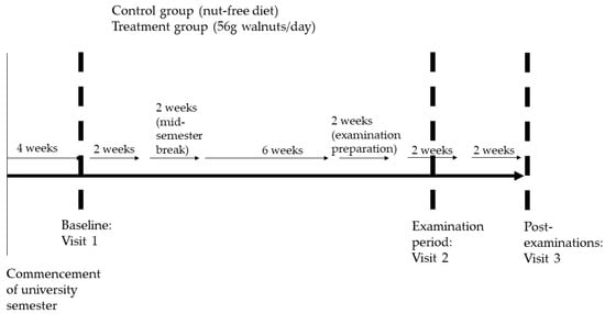The study was a randomised feeding trial and is registered on the Australian New Zealand Clinical Trials Registry (Registration Number ACTRN12619000972123). The trial took place during the university semester where participants were either allocated to a treatment group where they were provided with fresh pre-portioned walnuts and asked to consume 1 portion (approximately 56 g) per day for the 16-week duration of the study, while the control group were asked to refrain from consuming any type of nut or fatty fish for the same duration. Participants were allowed to incorporate each portion of walnuts into their existing diet at any time of the day. Previous studies have administered walnuts to their participants in amounts between 30 g and 75 g [,] although the currently recommended intake in Australian nutritional guidelines is about 30 g []. The portion of 56 g of walnuts administered to participants was chosen based on the previously published literature and work of Pribis et al. [] who administered 60 g of walnuts to university students. A 16-week duration for walnut consumption was based on the timeline of the University of South Australia’s teaching semester and examination period (Scheme 1). Recruitment and clinical visits were conducted across 3 university semesters within a 2-year period, making up 3 cohorts of participants. Cohort 1 was conducted in semester 2 2019 (August–December), cohort 2 in semester 2 2020 (August–December) and cohort 3 in semester 1 2021 (February–July). All participants attended 3 clinical visits (Scheme 1) at the University of South Australia Clinical Trial Facility where a blood sample and saliva sample were provided at each clinical visit. The first clinical visit served as a baseline at the beginning of the university semester, with the second visit occurring during the examination period and the final visit 2 weeks following. All participants completed a series of questionnaires at each clinical visit including the 21-item Depression Anxiety Stress Scale (DASS21), Perceived Stress Scale (PSS), Short-form Mental Health Continuum Questionnaire (MHC), Profile of Mood States Questionnaire (POMS), 8-dimension Assessing Quality of Life Questionnaire (AQoL-8D), the Active Australia Survey (AAS) and the Leed’s Sleep Evaluation Questionnaire (LSE). The POMS was defined as a primary outcome measure amongst the questionnaires, while all other questionnaires were defined as secondary outcome measures.