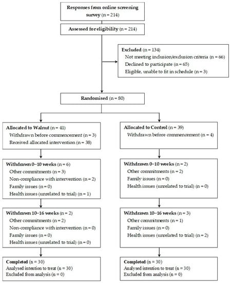 Healthy male and female undergraduate students aged between 18 and 35 were recruited through advertisements on campus at the University of South Australia, Australia. All participants were screened prior to enrolment into the study by an online screening questionnaire, followed by an informational group meeting and a diet and lifestyle questionnaire. Individuals who consumed >2 serves (56 g) of nuts per week or >2 capsules of fish oil per day, used any medication for depression, anxiety or any other neurological or psychiatric conditions, or used oral or pulmonary steroids in the previous 3 months were excluded from the study. Any individuals in cohorts 2 & 3 (see Section 2.2) who used any antibiotics or probiotic supplements in the previous month were excluded from the study to account for the inclusion of faecal microbiota analyses (see Section 2.5). Individuals with any nut allergies, who were night shift workers or who were pregnant were also excluded. All participants were asked to maintain their level of physical activity throughout the study. Written informed consent was obtained from all participants and the study was approved by the institutional review board of the University of South Australia, South Australia, Australia. Of 214 expressions of interest, a total of 80 eligible participants were included in the study and randomised, using simple randomisation, to either the treatment group or control group.