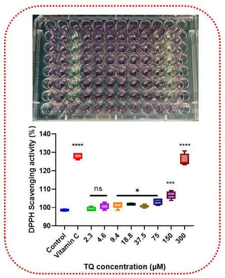 In vitro, an antioxidant assay of TQ revealed the presence of antioxidant potential. TQ’s radical scavenging action was validated using the DPPH assay. TQ converted the stable radical DPPH to the yellow diphenyl picrylhydrazine. As shown in Figure 1, a low concentration of TQ (<4.6 µM) did not induce a significant effect on DPPH scavenger activity. Meanwhile, a concentration-dependent significant impact (p < 0.05–0.0001) was detected at higher concentrations, reaching 27.2% of DPPH scavenging activity at 300 µM of TQ. Adding vitamin C as a positive control resulted in a 28.22% reduction in DPPH at 10 µM.