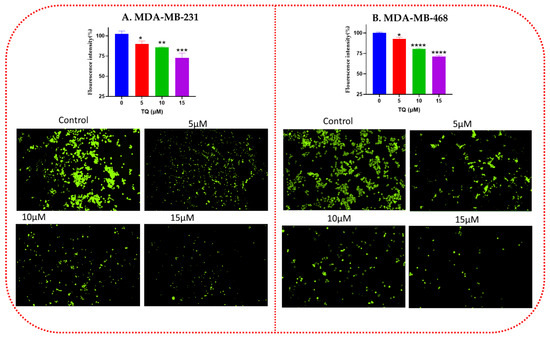 The intracellular level of ROS in TQ-treated MDA-MB-231 (A) and MDA-MB-468 (B) TNBC cells. The effects of TQ on the intracellular ROS level of TNBC cells were examined by DCFH-DA assay. TNBC cells were treated with different concentrations of TQ (5–15 µM) for 24 h, followed by 45 min incubation period with 10 µM DCFDA. TQ significantly reduced the ROS level compared to control groups in a concentration-dependent manner. A Synergy HTX Multi-Mode microplate reader (BioTek Instruments, Inc., Winooski, VT, USA) was used to measure ROS fluorescence. The green fluorescence of the reacted DCFH-DA, which indicates the ROS level, was observed with fluorescence microscopy using Nikon inverted microscope eclipse (NY 11747-3064, USA). Three independent experiments/3 replicates each was conducted to generate the data and presented as mean ± SEM. Asterisks indicate a significant reduction in ROS level compared with control cells only (* p < 0.05, ** p < 0.01, *** p < 0.001, **** p < 0.0001). ROS, reactive oxygen species; DCFH-DA, 2,7-dichlorodihydrofluorescein diacetate; TQ, Thymoquinone.