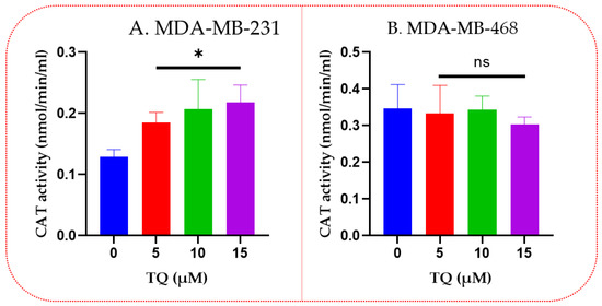 TQ impact on catalase enzyme activity in TNBC cells. 1.5 × 106 cells/well/6-well plate was incubated overnight, then treated for 24 h with TQ at various concentrations (0–15 µM). Catalase activity was displayed on MDA-MB-231 TNBC cells (A) and MDA-MB-468 TNBC cells (B). Asterisks show that catalase activity has significantly increased when compared to controls. Each bar indicates the mean ± SEM of three replications using a one-way ANOVA. * p < 0.05 is statistical significance, and ns: nonsignificant.