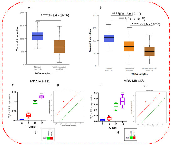 TQ’s effects on Nrf2 mRNA expression. UALCAN database showed the expression of Nrf2 in BRCA based on normal breast vs. TNBC (A) and the expression of Nrf2 in BRCA based on the patient’s race (B). (C,F) The box and violin graph depicted the relative Nrf2 mRNA expression after 5, 10, and 15 µM TQ treatment versus control after 24 h incubation. The red dot represents Nrf2 upregulation at 15 µM of TQ (D,G). The green color represents Nrf2 downregulation, while the red color represents Nrf2 upregulation at 15 µM of TQ (E,H). The CFX96 software was used to analyze the expression. The error bars represent the mean and the standard error of the mean. A non-parametric student t-test was used to identify significant differences (n = 3 per treatment in four independent experiments: ** p < 0.01, **** p < 0.0001 (comparing DMSO- and TQ-treated groups).