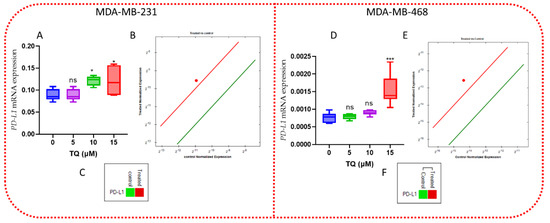 TQ’s effects on PD−L1 mRNA expression. (A,D) The box and violin graph depicted the relative PD−L1 mRNA expression after 15 µM TQ treatment versus control after 24 h incubation. The red dot represents PD−L1 upregulation at 15 µM TQ (B,E). The green color represents PD−L1 downregulation, while the red represents PD−L1 upregulation 15 µM TQ (C,F). The CFX96 software was used to analyze the expression. The error bars represent the mean and the standard error of the mean. A non-parametric student t−test was used to identify significant differences (n = 3 per treatment in four independent experiments: * p < 0.05, *** p < 0.001, ns-nonsignificant comparing DMSO−and TQ-treated groups).