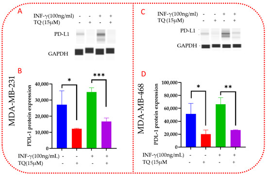 In contrast to the mRNA expression, protein expression of PD-L1 was reduced in MDA-MB-231 cells after treatment with TQ (Figure 12A,B, Supplementary Figure S3). When compared to the control (p = 0.048), it was significantly reduced by more than 2-fold (2.09). TQ reduced PD-L1 expression by 61 percent compared to the control (p = 0.049) in MDA-MB-468 (Figure 12C,D, Supplementary Figure S4). PD-L1 expression was reduced by more than two-fold (p = 0.049) relative to the control. In contrast to the mRNA expression, protein expression results of PD-L1 in both cell lines were decreased. This effect could imply that TQ regulates PD-L1 protein post-translational modification rather than mRNA. The date was normalized with GAPDH as an internal control.