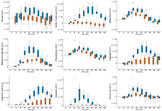 Among the 30 compounds with a postprandial effect after the intake of milk or yogurt, 29 were also detected in the serum after ingestion of HFM. Twenty-one of these compounds had a positive iAUC, which was significant for 10 of them. Eight compounds had negative iAUCs, five of which were significant. Only galactose could not be detected after the intake of HFM. Given that HFM was ingested in a higher caloric amount than the dairy products, the iAUC results of the individual metabolites were not statistically compared.