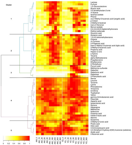 The median kinetics of all 65 postprandial active compounds in serum are shown in the heatmap of Figure 2. The fasting profiles before milk and yogurt intake were similar, in agreement with the finding that no significant differences were found in the levels of these metabolites. Acetic acid, 2-butenoic acid, 3-aminobutyric acid, sotolone, oleic acid, pivalic acid, and 3-methyl-2-furoic acid grouped in cluster 5 and showed a negative iAUC over the 0–6 h time period after both milk and yogurt intake. Most amino acids and their derivatives grouped in cluster 4 and showed a similar kinetic with a relative maximum at 60 to 120 min after the intake of milk and yogurt. Galactose, galactonic acid, galactonate, methionine sulfoxide, pyruvic acid, and 3-phenyllactic acid grouped in cluster 3 and were more elevated in serum after the consumption of yogurt than after milk intake. Most hydrocarbons, octanal, heptan-2-one, glutamic acid, and four acids (2-propenoic acid, tiglic acid, 3-methyl-2-butenoic acid, and propionic acid) showed a similar kinetic with a relative maximum at 120 to 180 min after milk and yogurt intake (cluster 2). Lastly, lactose, furfural, 1,5-gluconolactone, butyric acid, and 3,5-dimethyloctan-2-one, m-xylene, isoamyl acetate, phenol, angelic acid, p-cresol, 2-mehyl-2-butenal, trans-2-nonenal, benzyl acetate 2,2,3,3,6,8,8,-heptamethylnonanone, diethyl carbonate, and gluconic acid grouped in cluster 1 and were more elevated in serum after milk intake than after yogurt intake.