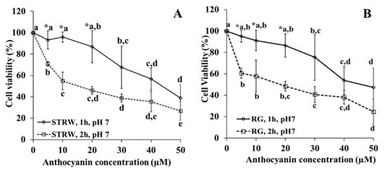 The effect of the concentration of strawberry (A) and red grape (B) anthocyanin on cytotoxicity at pH 7, incubation for 1 and 2 h at 37 °C. STRW = strawberry, RG = red grape. * Indicates significant difference (p < 0.05) for comparison at the same concentration but at different time of incubation. Lower case letters compare values for the same time of incubation at different concentration, with different letters in the compared values denoting significant difference at p < 0.05.