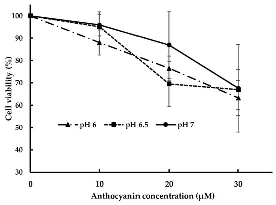 In terms of pH effect on cytotoxicity, the pH from 6–7 showed no different toxicity at corresponding anthocyanin concentration. To minimize the effects of cytotoxicity, the concentration of 10 µM at pH 7 and 6.5 was chosen for the experiment of the effect of pH on the anthocyanin uptake. At this concentration and pH, the cells had the highest and similar viability.