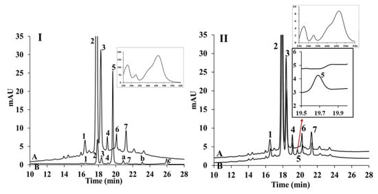 To assess degradation due to the pH, strawberry juice extract was incubated under the same conditions in the absence of the cells (Figure 3II). The appearance of peak 5 within 1 h incubation in the absence of cells suggested that the compound corresponding to peak 5 was formed by chemical reaction such as oxidation, cleavage and ring opening or reaction with other compounds during the incubation and was not a metabolite formed by the Caco-2 cells. Anthocyanins can form additional compounds important for copigmentation with phenolic acids [] and can form pyranoanthocyanins [].