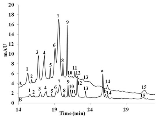 Red grape extract chromatogram (A) prior to cell uptake experiment, (B) extracted from cells following the uptake experiment: 1 = delphinidin-3-glucoside, 3 = cyanidin-3-glucoside, 4 = petunidin-3-glucoside, 6 = peonidin-3-glucoside, 7 = malvidin-3-glucoside, 8 = peonidin-3-glucoside pyruvic acid, 9 = malvidin-3-glucoside pyruvic acid; peaks 2, 5, 10, 11, 12, 13, 14 and 15 were unknown; peaks a, b appeared following uptake experiment.