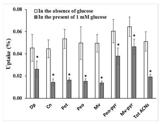 The influence of 1 mM glucose on the uptake of red grape anthocyanins by Caco-2 cells. Dp (delphinidin-3-glucoside), Cn (cyanidin-3-glucoside), Pet (petunidin-3-glucoside), Peo (peonidin-3-glucoside), Mv (malvidin-3-glucoside), Peo-pyr (peonidin-3-glucoside pyruvic acid), Mv-pyr (malvidin-3-glucoside pyruvic acid), Tot ACNs (total anthocyanins). * significant at p < 0.05.
