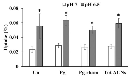 The increase in strawberry anthocyanin uptake with decreasing pH from pH 7 to 6.5 at a concentration of 10 µM anthocyanins. Cn (Cyanidin-3-glucoside), Pg (Pelargonidin-3-glucoside), Pg-rham (Pelargonidin-3-rhamnosylglucoside), Tot ACN (Total anthocyanins). * significant at p < 0.05.