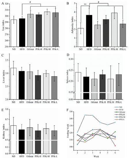 Effects of PFK on body index. (A) Lee’s index, (B) adiposity index, (C) liver index, (D) spleen index, (E) kidney index, and (F) feeding yield. ND group: normal diet + 0.5% CMC-Na; HFD group: high-fat diet + 0.5% CMC-Na; Orlistat group: high-fat diet + 20 mg/kg orlistat; PFK-H group: high-fat diet + 400 mg/kg krill oil, 40 mg/kg fucoxanthin, 200 mg/kg phycobiliprotein; PFK-M group: high-fat diet + 200 mg/kg krill oil, 20 mg/kg fucoxanthin, 100 mg/kg phycobiliprotein; PFK-L group: high-fat diet + 100 mg/kg krill oil, 10 mg/kg fucoxanthin, 50 mg/kg phycobiliprotein. The values were reported as the mean ± SD of rats per group. ** p < 0.01, # p < 0.05.