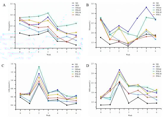 Effects of PFK on serum lipids. (A) TC, (B) TG, (C) LDL-C, (D) HDL-C. ND group: normal diet + 0.5% CMC-Na; HFD group: high-fat diet + 0.5% CMC-Na; Orlistat group: high-fat diet + 20 mg/kg orlistat; PFK-H group: high-fat diet + 400 mg/kg krill oil, 40 mg/kg fucoxanthin, 200 mg/kg phycobiliprotein; PFK-M group: high-fat diet + 200 mg/kg krill oil, 20 mg/kg fucoxanthin, 100 mg/kg phycobiliprotein; PFK-L group: high-fat diet + 100 mg/kg krill oil, 10 mg/kg fucoxanthin, 50 mg/kg phycobiliprotein.