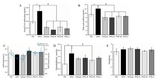 The level of acetyl-CoA carboxylase (ACC) and fatty acid synthase (FAS) in the HFD group were significantly increased compared with the ND group (p < 0.05). There was a reduction with the treatment of orlistat and PFK complex (Figure 4A,B). The ACC and FAS were 0.18 ± 0.05 ng/mL and 8.67 ± 0.41 ng/mL with the PFK-L group producing an effect comparable to that of the PFK-H group and PFK-M group (p < 0.05), which was slightly lower than the Orlistat group. It demonstrated that the PFK complex had a good effect on the decrease of blood lipids, according to the guidance method for the evaluation of weight loss function by the China Food and Drug Administration.