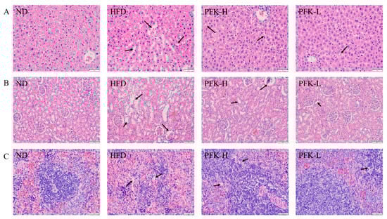 H and E staining of tissue. (A) Liver, (B) kidney, (C) spleen. ND group: normal diet + 0.5% CMC-Na; HFD group: high-fat diet + 0.5% CMC-Na; PFK-H group: high-fat diet + 400 mg/kg krill oil, 40 mg/kg fucoxanthin, 200 mg/kg phycobiliprotein; PFK-L group: high-fat diet + 100 mg/kg krill oil, 10 mg/kg fucoxanthin, 50 mg/kg phycobiliprotein.