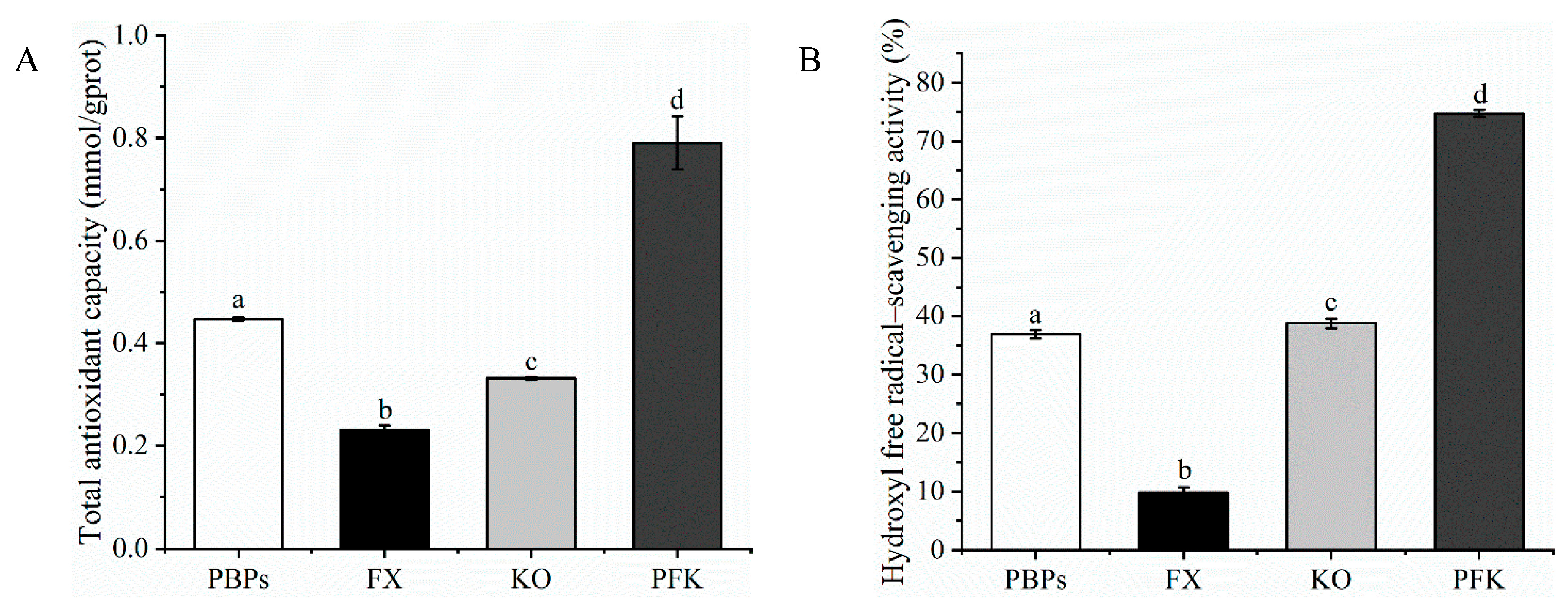 The total antioxidant activity was measured with reference to a test kit (Nanjing Jiancheng Corp., Nanjing, China). A standard curve was developed with absorbance as the vertical coordinate and standard sample concentration as the horizontal coordinate. The reaction mixture contained 5 μL of the sample (7.5 mg/mL PBPs, 1.5 mg/mL FX, 15 mg/mL KO, and 7.5 mg/mL PBPs, 1.5 mg/mL FX, 15 mg/mL KO low dose of PFK complex) and 180 μL of the ferric reducing ability of plasma working solution. After incubation at 37 °C in a water bath for 10 min, the absorbance was determined at 593 nm. The total antioxidant activity of the sample was calculated using the standard curve.