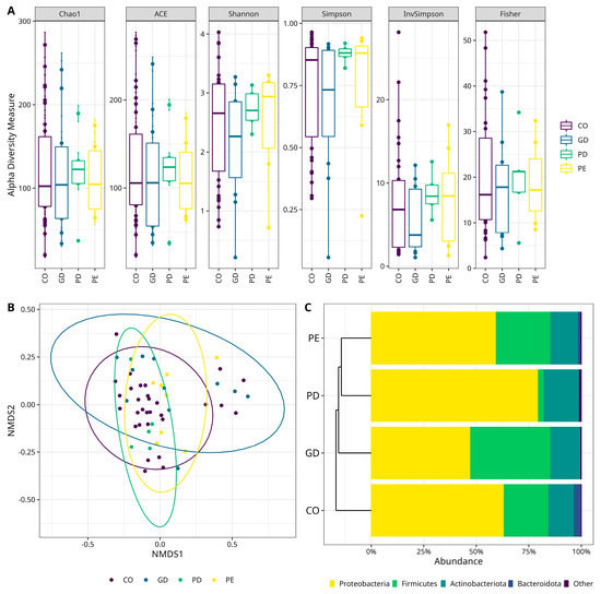 Characterization of the bacterial diversity in the different studied samples. (A) Alpha diversity box plots. The Y-axes indicate the values for the species richness indexes (Chao1, ACE), and diversity indexes (Shannon, Simpson, InvSimpson, and Fisher). The type of sample is shown on the right. Supplementary Material—(see Supplementary Materials Table S2 for numerical data of indexes). (B) Beta diversity Non-Metric Multidimensional Scaling (NMDS) scatter plots. The graphics show bacterial beta diversity calculated by NMDS ordination based on the UniFrac distance matrix. The scatter plots were generated in R. The samples CO and GD differed significantly according to ANOSIM (p = 0.01). (C) Bacterial Phyla relative abundance stacked bar plots. Color sectors indicate taxa as denoted by tags at the bottom of the figure; abundances are shown as a percentage on the X-axis. The type of sample is shown on the left side of the figure. The graphic shows the four top more abundant phyla, while “Other” includes phyla with <1% relative abundance—(see Supplementary Materials for numerical data abundances and statistical test for CO versus GD, Table S3; CO versus PD, Table S4, and CO versus PE, Table S5). PE (Pre-Eclampsia), PD (Pre-gestational Diabetes), GD (Gestational Diabetes), and CO (Control).
