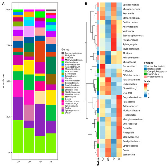 Relative abundances of bacterial genera in the studied samples. (A) Stacked bar plots with relative abundances of bacteria. Color sectors indicate taxa as indicated by tags at the right side of the figure; abundances are shown as percentages on the Y-axis. The graphic shows the twenty-six topmost abundant genera, while “Other” group genera with <1% relative abundance—(see Supplementary Materials for numerical data abundance and statistical test for CO versus GD, Table S6; CO versus PD, Table S7, and CO versus PE, Table S8). (B) Core microbiota heatmap among samples. Columns show the abundance of core microbiota members with a prevalence of at least 50% in the samples and an abundance ≥1%. The color scale from blue (−2) to red (2) indicates the relative abundance normalized from the core taxa of groups. Color keys for phyla are shown on the left side of the figure. NK4A136 (Lachnospiraceae), UCG-001 (Prevotellaceae), Escherichia (Escherichia-Shigella), Allorhizobium (Allorhizobium-Neorhizobium-Pararhizobium-Rhizobium), Methylobacterium (Methylobacterium-Methylorubrum), Clostridium_1 (Clostridium_sensu_stricto_1). The type of sample is indicated at the bottom of the figure, where PE (Pre-Eclampsia), PD (Pre-gestational Diabetes), GD (Gestational Diabetes), and CO (Control).