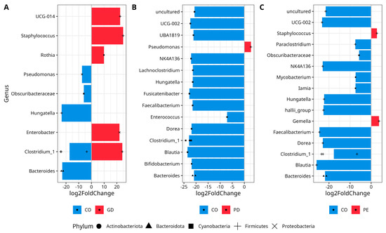 Differential abundance analysis of bacterial genera with DESeq2. The Figure shows data for (A) CO vs. GD, (B) CO vs. PD, and (C) CO vs. PE. Normalization was made with size factor from counts geometric means and the Wald test was applied to calculate differences between groups, False Discovery Rate (FDR) was used to correct p-values. Log2 Fold Change is shown by the horizontal bars. Bacterial taxa with q values <0.05 are written alongside the Y-axis. Phyla are shown with a black solid circle (Actinobacteriota), black solid triangle (Bacteroidota), black solid square (Cyanobacteria), plus symbol (Firmicutes), and cross symbol (Proteobacteria) at the bottom. The repetition of symbols indicates that more than one ASV was reported in the analyses. UCG-014 (Class Clostridia), Clostridium_1 (Clostridium_sensu_stricto_1), uncultured (Oscillospiraceae), UCG-002 (Oscillospiraceae), UBA1819 (Oscillospiraceae), NK4A136 (Lachnospiraceae), halli_group (Eubacterium). —(see Supplementary Materials for full taxon description, log2FoldChange, p, and p-adjusted values for CO versus GD, Table S9; CO versus PDF, Table S10, and CO versus PE, Table S11).
