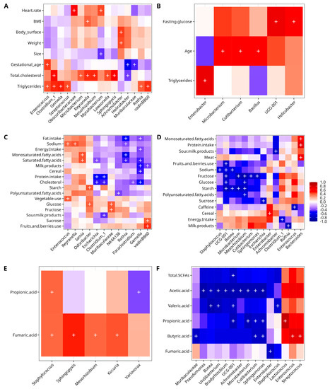 Spearman correlation analysis of clinical data and other variables with bacterial abundance. Anthropometric and clinical for CO (A), and GD (B); dietary for CO (C) and GD (D), and SCFA for CO (E) and GD (F). Columns in the heatmaps show the bacterial taxa, while rows show the numerical metadata. The correlation is measured by the color key from blue (−1, negative) to red (+1, positive). The plus symbol “+” denotes a significance of p < 0.001. vadinBB60 (Class Clostridia); UCG001 (Prevotellaceae); NK4A136 (Lachnospiraceae), Clostridium_1 (Clostridium_sensu_stricto_1), Escherichia (Escherichia-Shigella).