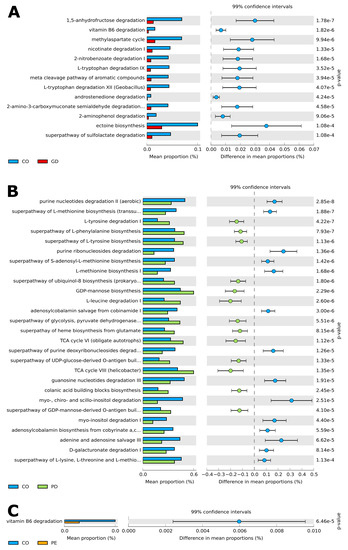 Prediction of functional microbial metabolic pathways using PICRUSt 2 analysis with the MetaCyc database. The graphics show the abundance of (A) thirteen statistically significant metabolic pathways between CO (blue color) and GD (red color) bacterial communities. (B) Twenty-seven statistically significant metabolic pathways between CO (blue color) and PD (green color) bacterial communities; and (C) one statistically significant metabolic pathway between CO (blue color) and PE (orange color) bacterial communities. Confidence intervals are indicated on top, while the mean proportions and differences in mean proportions with percentage scale are shown underneath each graphic. Groups are identified by a tab placed below the graphics. A Welch test was applied with a Bonferroni post-hoc. Corrected p-values are shown on the right side of each graphic. —(see Supplementary Materials Table S12 for all included statistically significant pathways q < 0.05).