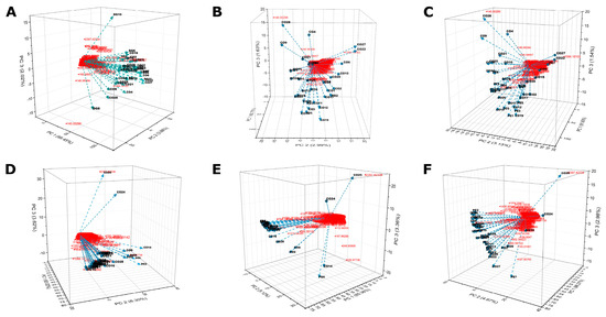 Analysis of metabolites in fecal samples by FT-ICR MS. Metabolites extracted from fecal samples were analyzed using a Fourier Transform Ion Cyclotron Resonance Mass Spectrophotometer (Solarix XR Bruker) calibrated in positive mode for CO versus GD (A), CO versus PD (B), CO versus PE (C), and negative mode for CO versus GD (D), CO versus PD (E), and CO versus PE (F) see Materials and Methods. For each graphic, the PC1, PC2, and PC3 axes indicate the PCA ordination as a percentage of the total variance explained. The red color is the m/z values and the lines with conic tips represent the samples that are identified by tags.
