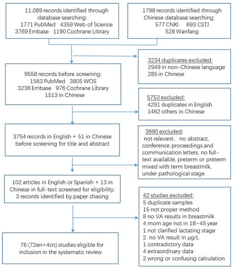 Articles in English were searched through PubMed, Web of Science, Embase and Cochrane Central Register of Controlled Trials employing matching keywords “vitamin A” or “retinol” with “human * milk”, “woman * milk”, “mother * milk”, “breast * milk”, “lactation” or “lactating”. Articles in Chinese were searched through the China National Knowledge Internet (CNKI), Wan Fang Database, or China Science and Technology Journal Database (CSTJ) utilizing matching Chinese keywords covering “human milk” and “vitamin A”, the former keyword including “human milk”, “breast milk”, or ”lactating mother” and the latter including “vitamins”, “vitamin A”, “retinol”, “nutrients” or “nutritional composition”. Articles published by 21 August 2021 were taken into account.