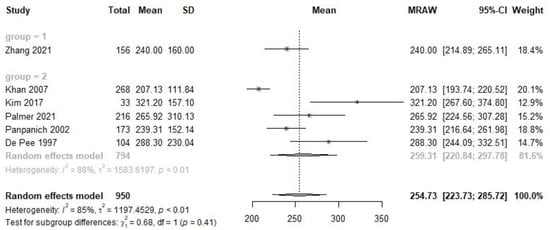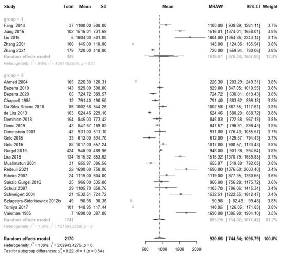 At the colostrum stage, which is within 7 days following delivery, there were five studies performed on 429 Chinese participants and twenty-two studies completed on 1741 non-Chinese subjects (Figure 2). The VA content with 95% CI was 1039.1 (470.3, 1607.8) µg/L in Chinese specimens and 895.75 (714.1, 1077.4) in non-Chinese. There was no statistically significant variance between the two population groups (X2 = 0.22, p = 0.64).