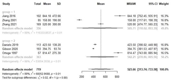 There were seven studies conducted among 1268 Chinese subjects and fifty-three studies among 5014 non-Chinese participants at the mature human milk stage (Figure S3), covering seven studies with 1112 Chinese and thirty-eight studies with 3221 non-Chinese at early mature stage (Figure 4), one study with 156 Chinese and five studies with 794 non-Chinese subjects at late mature stage (Figure 5). The VA concentration with 95% CI between Chinese and non-Chinese participants was 386.4 (270.6, 502.3) µg/L vs. 385.2 (335.1, 435.3) µg/L at the mature stage (X2 = 0.00, p = 0.98), 408.4 (282.6, 534.1) µg/L vs. 401.2 (333.6, 468.8) µg/L at the early mature stage (X2 = 0.01, p = 0.92) and 240.0 (214.9, 265.1) µg/L vs. 259.3 (220.8, 297.8) µg/L at the late mature stage (X2 = 0.68, p = 0.41). There was no significant difference when comparing population subgroups at the mature, early mature or late mature lactation stage.