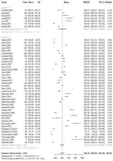 The I2 test with a significance level of α = 0.05 was used to visually analyze heterogeneity among studies regarding the human milk VA level and to quantify the magnitude of heterogeneity. Individual trials were examined using sensitivity analysis at each stage of breastfeeding. Sources of heterogeneity were assessed using meta-regression analysis, which included research design, publication year, mother’s age, country, sampling time, sampling volume, and whether the breast was empty after sampled. R packages version 4.1.3 (10 March 2022) were used for meta-analysis and meta-regression.
