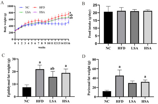 As shown in Figure 1A, the weight of rats in the HFD group was higher than that in the NC group after 16 weeks of feeding. Compared with the HFD group, the final body weight of LSA group and HSA group decreased by 17.4% and 21.6%, respectively (p < 0.05 for both). No significant differences in food intake were observed among the four groups (p > 0.05, Figure 1B). As shown in Figure 1C,D, the weight of epididymal and perirenal fat in the HFD group were significantly higher than those in the NC group (p < 0.05) and the LSA group significantly decreased the weight of epididymal fat (p < 0.05).