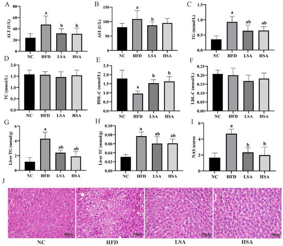 SA supplementation ameliorated NAFLD-related parameters. (A) Serum ALT; (B) serum AST; (C) serum TG; (D) serum TC; (E) serum HDL-C; (F) serum LDL-C; (G) liver triglyceride (liver TG); (H) liver total cholesterol (liver TC); n = 8 each group for (A–H); (I) NAS scores; (J) liver tissues with H&E staining (magnification, ×400; scale bars, 50 µm; n = 3 each group). a p < 0.05, compared to the NC group; b p < 0.05, compared to the HFD group.