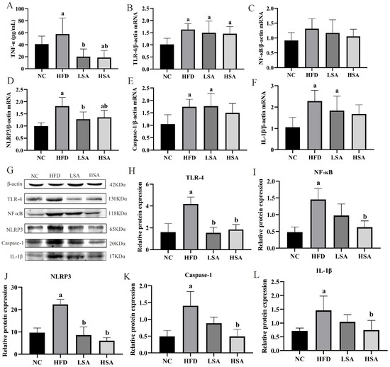 SA supplementation inhibited hepatic inflammation. (A) Serum TNF-α, n = 8 each group; (B–F) relative mRNA expression of TLR-4, NF-κB, NLRP3, caspase-1 and IL-1β, n = 6 each group; (G) western blot assay of proteins in liver, n = 3 each group; (H) quantitative analyses of the TLR-4 protein; (I) quantitative analyses of the NF-κB protein; (J) quantitative analyses of the NLRP3 protein; (K) quantitative analyses of the caspase-1 protein; (L) quantitative analyses of the IL-1β protein. a p < 0.05, compared to the NC group; b p < 0.05, compared to the HFD group.