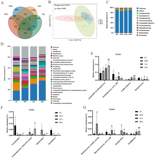 SA supplementation altered overall gut microbial structure. (A) Venn diagram, the numbers indicated sequencing reads; (B) principal coordinates analysis; (C) the microbial distributions at the phylum level; (D) the microbial distributions at the genus level; (E−G) relative abundance of bacteria at the genus level. n = 5−6 each group. a p < 0.05, compared to the NC group; b p < 0.05, compared to the HFD group; c p < 0.05, compared to the LSA group.