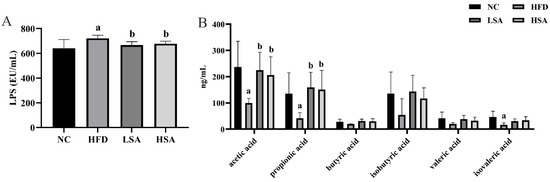 SA supplementation affected the gut microbial-derived metabolites. (A) Serum LPS; n = 8 each group; (B) fecal levels of SCFAs, n = 6 each group. a p < 0.05, compared to the NC group; b p < 0.05, compared to the HFD group.