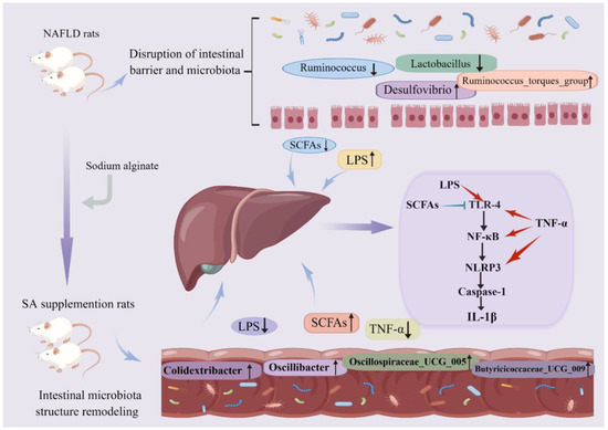 SA-alleviated inflammation by modulating the gut–liver axis in HFD-fed rats. The black upward arrows represent increase; the black downward arrows represent decrease; the red arrows represent promotion.
