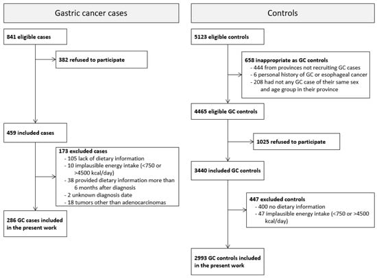 Initially, 459 cases of GC and 3440 controls were enrolled, with 344 (75%) cases and 2993 (87%) controls providing valid dietary information. Cases whose dietary information was collected more than 6 months after diagnosis (n = 38), with an uncertain diagnosis date (n = 2), or with tumors that were not adenocarcinomas (n = 18) were excluded from the analyses. Therefore, the present study included 286 GAC cases and 2993 controls aged 26 to 85 years (Figure 1).