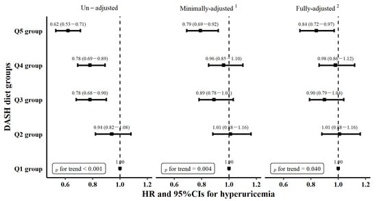 The multivariable Cox proportional hazards models were adopted to calculate the associations between DASH dietary groups and the risk of incident hyperuricemia. Initially, an unadjusted model was fitted. Then, a model minimally adjusted for baseline age (continuous) and sex (men or women) at baseline was fitted. Next, a fully adjusted model based on previous evidence was fitted to additionally adjust for marital status (married or not), education level (middle school or below, high school, and college or above), family history of hyperuricemia or gout (yes or no), BMI groups (normal, overweight, or obese), hypertension (yes or no), diabetes (yes or no), hyperlipemia (yes or no), smoking (never or ever), alcohol drinking (never or ever), PA (low level or moderate-to-high level), and total energy intake (continuous) at baseline. Finally, using the fully adjusted model, an analysis was performed by excluding participants who were diagnosed within 6 months and 12 months after baseline survey. The Schoenfeld individual test was used to test the proportional hazard. Conditional hazard ratio (HR) and 95% confidence intervals (CIs) of incident hyperuricemia for the Q2 group to Q5 group were calculated, compared with the Q1 group (the lowest adherence to DASH diet).