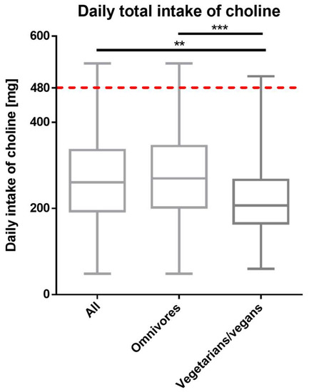 Total (dietary and supplementary) daily choline intake in all (n = 273), omnivorous (n = 217) and vegetarian/vegan (n = 56) participants (outliers excluded). The red dotted line represents the choline AI of 480 mg/day. Data are presented as median with whiskers from ‘min to max’ and was analyzed with Kruskal–Wallis test following the Dunn’s test for multiple comparisons (** adjusted p value < 0.01; *** adjusted p value < 0.001).