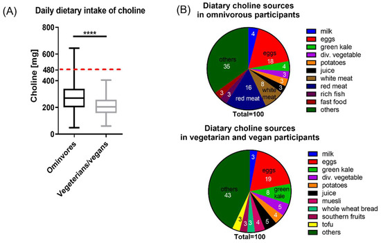 Dietary choline intake. (A) Daily dietary choline intake in omnivorous and vegetarian/vegan participants. The AI of 480 mg/day is represented by the red dotted line. Data are presented as median with whiskers from ‘min to max’ and was analyzed with Mann–Whitney test (**** p < 0.0001). (B) Dietary choline sources in omnivorous and vegetarian/vegan participants. Data are shown as parts of 100, numbers in the graph indicate the mean contribution of the given food to the total dietary choline intake.