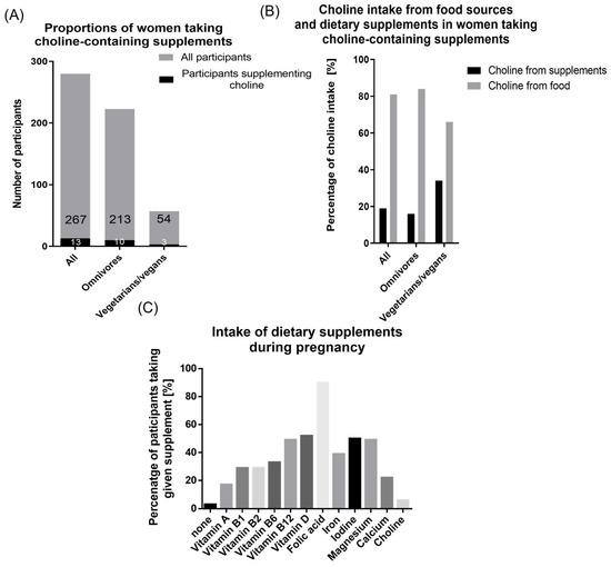 Intake of dietary supplements. (A) Proportion of participants taking choline-containing dietary supplements in all (13/267), omnivorous (10/213), and vegetarian/vegan (3/54) participants (B) Percentage of choline coming from food sources and dietary supplements in participants supplementing choline (all n = 13; omnivore n = 10, vegetarian/vegan n = 3) (C) Intake of dietary supplements during pregnancy. Percentage of participants taking given supplement alone or as a part of a prenatal vitamin complex supplement.